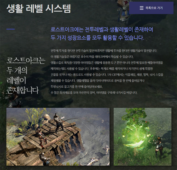 또 로스트아크에는 전투 레벨과 별개로 생활 레벨이 존재하며 전투에 유용한 아이템을 제작하거나 배를 제작하고 자신만의 섬에 건물을 짓는 등 다양한 용도로 활용할 수 있다. 1차 CBT에서는 식물 채집과 채광, 벌목, 낚시 총 4개의 생활 콘텐츠를 테스트할 수 있다.