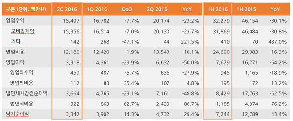 5일 공시된 회사의 2분기 매출은 155억원으로 2016년 1분기 매출인 168억원 대비 7.7% 하락한 수치다. 또 영업이익은 33억원으로 1분기 영업이익인 43억원 대비 23.9% 감소했으며 당기순이익은 33억원으로 1분기에 기록한 39억원 대비 14.3% 감소한 것으로 나타났다.