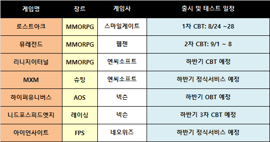 국산 PC온라인게임의 경우 24일부터 CBT(비공개테스트)를 진행 중인 스마일게이트의 ‘로스트아크’와 9월 1일부터 2차 CBT에 돌입하는 웹젠의 ‘뮤레전드’, 하반기 중 첫 CBT 예정인 엔씨소프트의 ‘리니지이터널’ 등 핵앤슬래시 RPG(역할수행게임) 기대작이 출격 대기 중이며 국산 온라인 맏형 ‘넥슨’도 ‘하이퍼유니버스’와 ‘니드포스피드엣지’ 등 신작을 하반기 중 테스트할 예정이다.