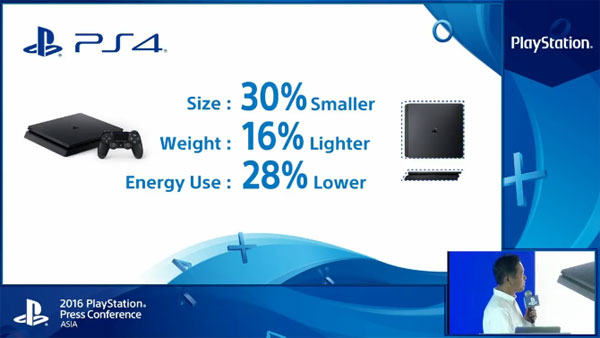 또 다른 신형 콘솔인 '슬림형 PS4'는 2013년 PS4 발매 이후 처음으로 외형 변화가 이뤄졌다. 또한 기존 PS4보다 크기와 무게를 각각 30%, 16% 줄이고 저력사용량도 28% 낮췄다.
