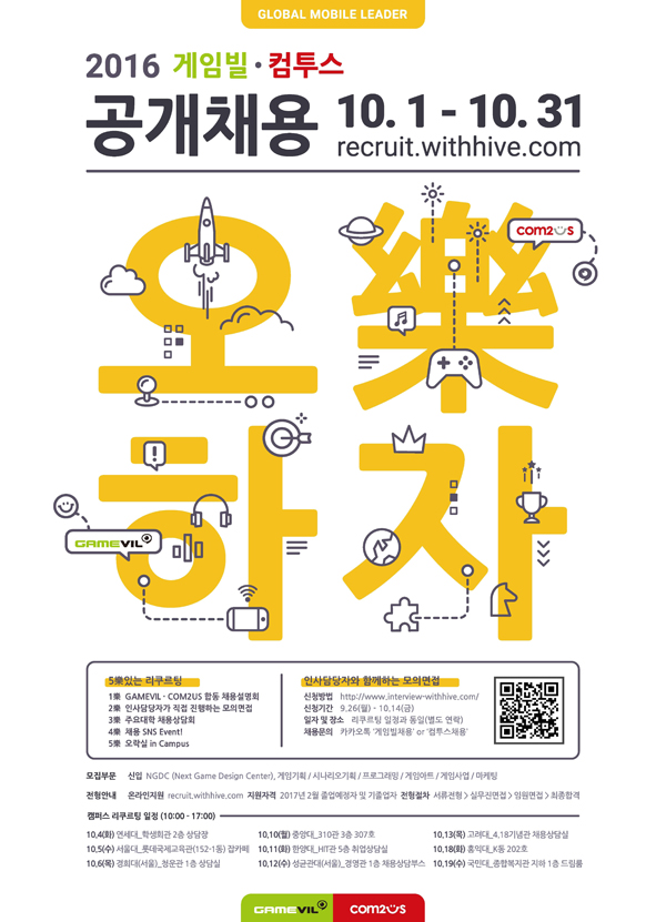 10월 1일부터 31일까지 공식 채용 홈페이지(recruit.withhive.com)를 통해 온라인 입사 지원이 이루어지며 ‘서류 전형’과 ‘실무진 면접’, ‘임원진 면접’을 거쳐 최종 입사하게 된다. 신입 사원의 경우 양사 대표 인재 양성 프로젝트인 ‘NGDC(Next Game Design Center)’에 소속돼 각 직군의 업무를 맡게 된다.