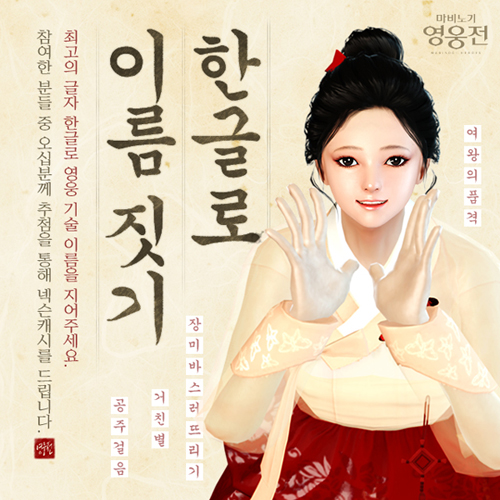 ‘마비노기 영웅전’에서는 13일까지 공식 페이스북을 통해 ‘영웅 기술 이름짓기 대회’를 실시, 게임 내 영웅들의 스킬 이름을 한글로 변경해 덧글로 남기는 유저 중 추첨을 통해 50명에게 ‘넥슨캐시’를 선물할 예정이다.