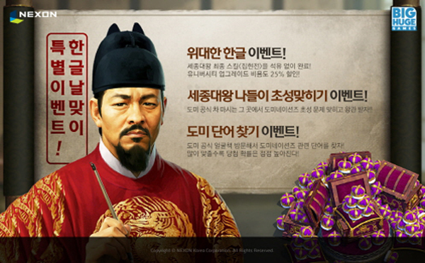 국내 최대 게임사 넥슨(대표 박지원)이 한글날을 맞아 자사가 서비스하는 인기 게임 10종에서 다양한 이벤트를 진행한다.