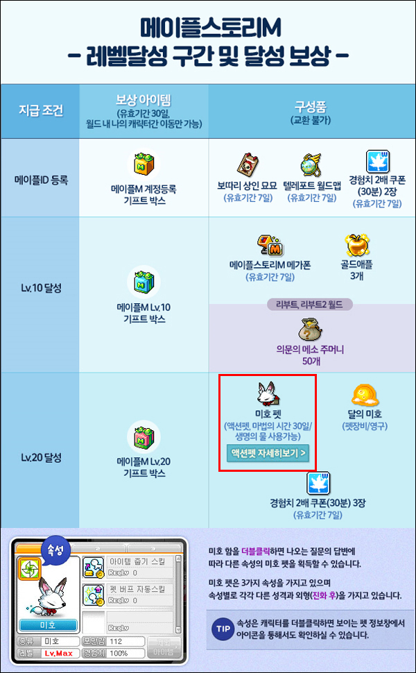 특히 메이플스토리M에서 20레벨만 달성해도 온라인 메이플스토리에서 사용할 수 있는 희귀 액션 펫 ‘미호’가 지급돼 큰 인기를 끌고 있으며 30레벨 달성 시에는 ‘주황버섯 빵모자’와 ‘멜빵 바지’ 등 외형 아이템이, 50레벨 달성 시에는 모든 능력치를 올려주는 기간 한정 장비가 주어진다.