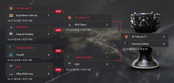 우리나라는 이번 롤드컵 진출팀 3팀을 모두 4강에 올리며 세계 최강 리그로서의 저력을 뽐냈다. 한국 대 한국, 한국 대 유럽 지역의 대결로 진행된 4강전 결과, SK텔레콤 T1이 ‘ROX 타이거즈’를 3대 2로 꺾고 2년 연속 결승전에 진출했으며, 삼성 갤럭시도 유럽의 강호 ‘H2K’를 3대 0으로 제압하고 결승전에 올랐다. 이로써 결승전에 맞붙게 될 양팀 모두 한국팀으로, 체계적인 한국 e스포츠 트레이닝 인프라와 선수 개개인의 노력이 만들어낸 결과를 전세계적으로 알리게 되었다.