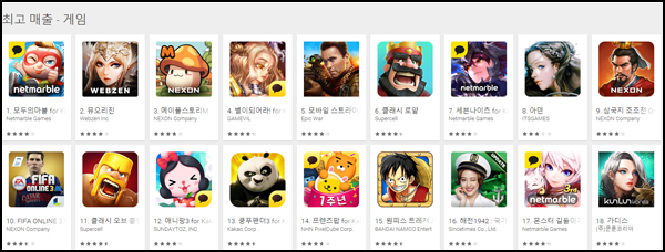 ▲ 2016년 10월 27일 오전 구글플레이 게임 부문 최고 매출 순위