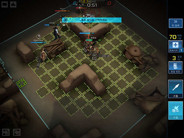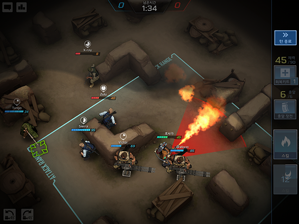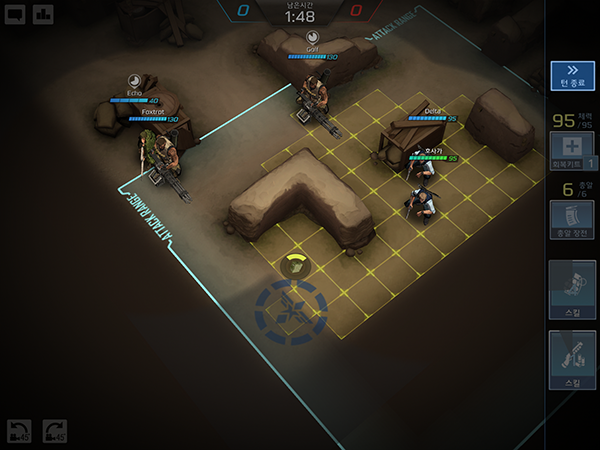 전투에 들어서면 공격 사거리가 표시되며, 엄폐에 따라 공격 명중률이 상승한다. 행동 뒤에는 쿨다운 시간이 있어 전략성이 요구된다.