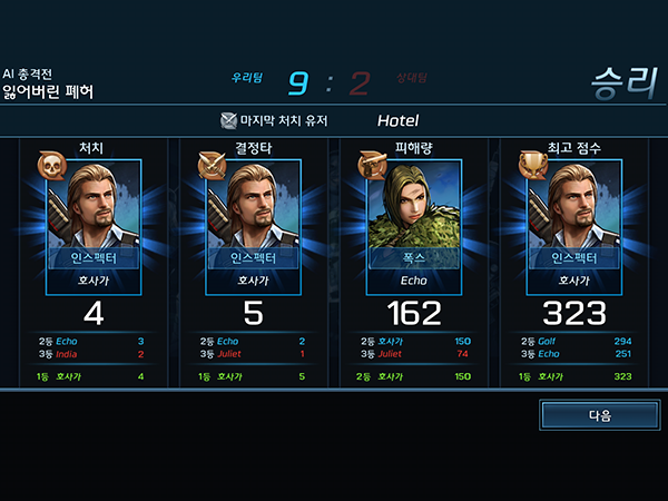 전투가 종료되면 각 부분별 순위가 표시된다.