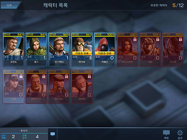 현재 테스트 버전에선 12종의 캐릭터가 구현됐다. 무료 캐릭터를 로테이션으로 제공한다.