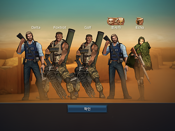 이번 테스트 버전에선 경찰 캐릭터와, 괴짜 노인, 사냥꾼 등 12종의 캐릭터가 구현됐다. 이용자는 각각 다른 개성과 스킬을 지닌 캐릭터를 골라 조합을 짜야 한다. 5명의 조합을 통해 전투에서 새로운 전략을 펼칠 수 있기 때문에 팀워크가 중요시 된다.