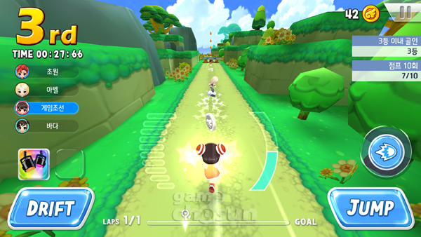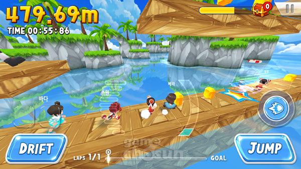 주요 콘텐츠인 달리기는 대시와 점프, 아이템 사용으로 주어진 트랙을 나아가는 방식이다. 더불어 PC온라인게임 카트라이더에서 볼수 있었던 드리프트를 탑재해 속도감을 높였다.