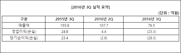 공시를 통해 밝힌 2016년 3분기 실적은 신작 출시일정의 변경 및 대규모 개발인력 충원 등에 따라 전기 대비 매출은 29% 하락했고, 영업이익과 당기순이익 모두 적자를 기록했다.