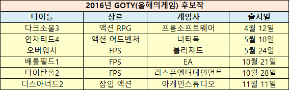 한국시각으로 28일 고티 집계 사이트 중 가장 공신력 높은 사이트로 불리는 ‘고티픽스(Game Of The Year Picks Blog)’에 따르면 현재 후보작으로 선정된 게임은 ‘언차티드4’와 ‘다크소울3’, ‘배틀필드1’, ‘타이탄폴2’, ‘디스아너드2’, ‘오버워치’로 총 6개. 그중 게이머들이 가장 주목하고 있는 게임은 언차티드4와 오버워치다.