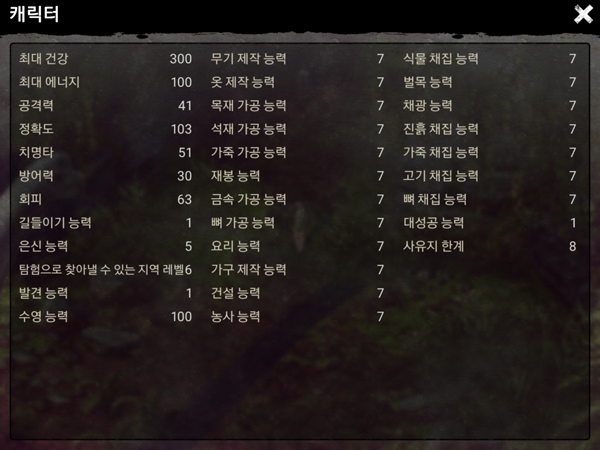 생명력은 이용자의 체력을 의미한다. 공룡에게 공격받거나 공격할 경우 체력이 깎이게 되며 생명력이 0이 될 경우 이용자는 사망한다. 에너지는 활동하기 위한 스테미너를 의미하며 음식물을 섭취함으로써 관리할 수 있다. 에너지가 0이 되면 배고픔으로 인해 생명력이 감소한다.