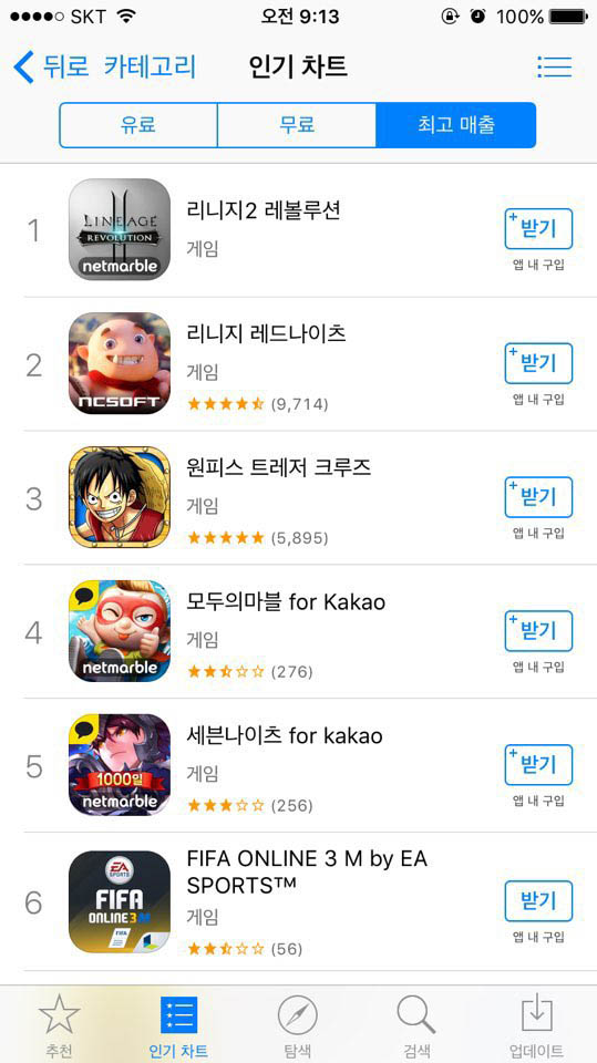 ▲ 2016년 12월 14일 오전 애플 앱스토어 매출 순위 갈무리
