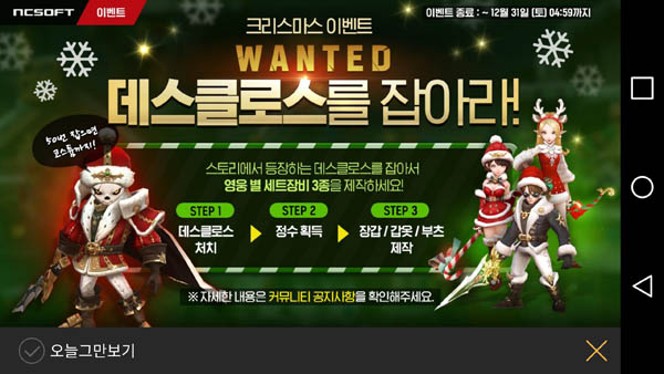 이번 패치를 통해 데스클로스를 잡아라 이벤트와 크리스마스 한정판 코스튬 추가, 데스클로스 보따리 기간한정 판매를 시작했다.