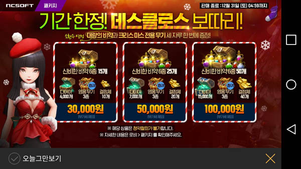 끝으로 이벤트 기간동안 3만원, 5만원, 10만원(부가세 제외) 패키지도 판매된다. 이는 소환수 연성에 필요한 신비한 비약과 크리스마스 전용 영웅 희귀 무기, 다이아, 결정체 등의 묶음 상품이다.