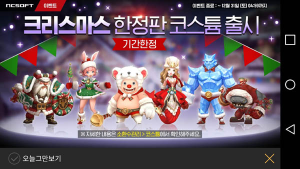 이와 함께 크리스마스 한정 코스튬도 추가됐다. 이는 버그베어, 인어, 드워프 검사, 아이스맨, 아린, 좀비로드 등 6종의 소환수의 코스튬이 게임 내 보석인 다이아 1000개로 각 소환수 코스튬 탭에서 구매할 수 있다.