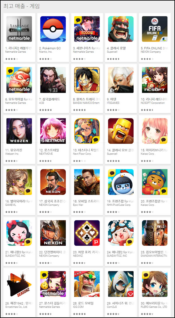 △ 2017년 1월 31일 구글플레이 게임 부문 최고 매출 순위