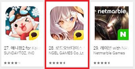 6일 오전 엔젤게임즈(대표 박지훈)의 자체개발 RPG(역할수행게임) '로드오브다이스 for kakao'가 구글플레이 게임부문 최고매출 순위 28위를 기록했다.