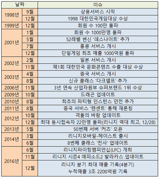 엔씨소프트를 이야기함에 있어 절대 빼놓을 수 없는 작품은 단연 '리니지'다. 1998년 정식서비스를 시작한 이 게임은 서비스 18년차인 2016년 역대 최고 매출인 3755억원을 달성하며 새 역사를 써내려가고 있다.