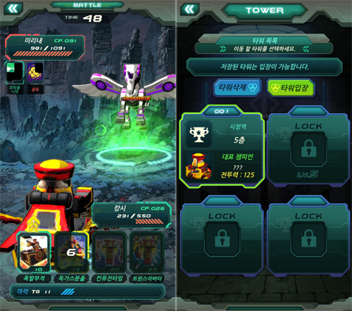 전투는 메카니멀을 강화시켜 개방한 스킬을 쿨타임마다 누르는 방식이다. 포켓몬고와는 다르게 속성에 따른 상성 관계는 없었다. 스킬 상성이 다소 존재할 순 있으나 결국 내 메카니멀의 캐릭터 수치(CP)가 얼마냐 높느냐가 관건이다. 내가 대전한 타워는 '타워목록'에 저장돼 타워 근처에 있지 않더라도 입장이 가능하다.