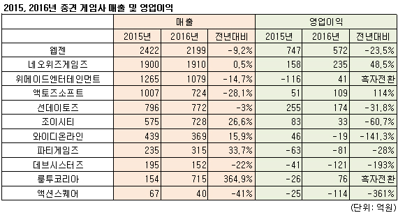 넥슨, 넷마블, 엔씨소프트 '빅3' 게임사들은 모바일게임에 힘입어 전년보다 증가한 매출을 달성했다. 반면, 게임 업계 허리라 불리는 중견 게임사는 2015년보다 적게 벌거나 웃도는 수준이다.