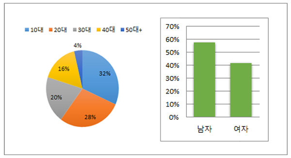△ 포켓몬고 주간 사용자 연령별(좌), 성별(우) 비중