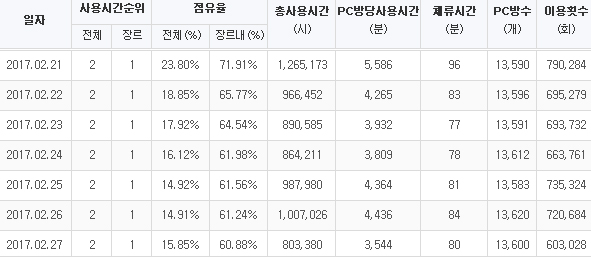 PC방 점유율 사이트 게임트릭스를 살펴보면 오버워치는 경쟁전 종료 전날인 21일 점유율 23%를 기록하고 있지만 22일 약 5%가 하락하면서 27일 15.85%까지 내려간 모습이다.
