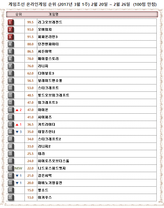 2017년 3월 첫째 주 온라인게임 순위는 잔잔한 모습을 보인 가운데 출시 전인 ‘니드포스피드엣지’가 순위권에 이름을 올리며 새 물결을 일으켰다.