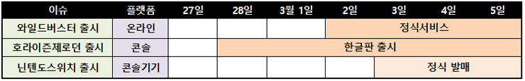 이번주 '기계 몬스터헌터'로 불리는 '호라이즌제로던'은 28일 한글판을 출시하며 국내 게이머들을 사로잡을 예정이다. 닌텐도는 차세대 콘솔기기 '닌텐도스위치'를 오는 3월 3일 정식발매한다. 또 온라인게임 '와일드버스터'가 3월 2일 오랜 담금질 끝에 정식 출격한다.
