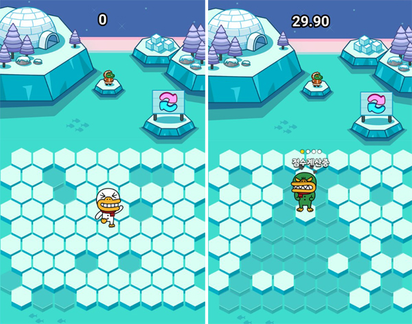 ‘튜브를 잡아라’는 고전 플래시게임 ‘고양이 잡기 게임’과 비슷한 방식이다. 흰색 빙판을 클릭하면 진한 색으로 바뀐다. 내가 클릭을 한 번 할 때마다 ‘튜브’ 캐릭터가 무작위 방향으로 한 칸 이동한다. 이 진한 색 빙판은 다시 터치할 수 없고 캐릭터가 이동할 수도 없는 곳이다. 마치 바둑을 두듯 튜브를 가두다 보면 캐릭터가 마지막 한 칸에 갇히게 되는데, 여기까지 걸린 시간에 따라 점수가 매겨진다.