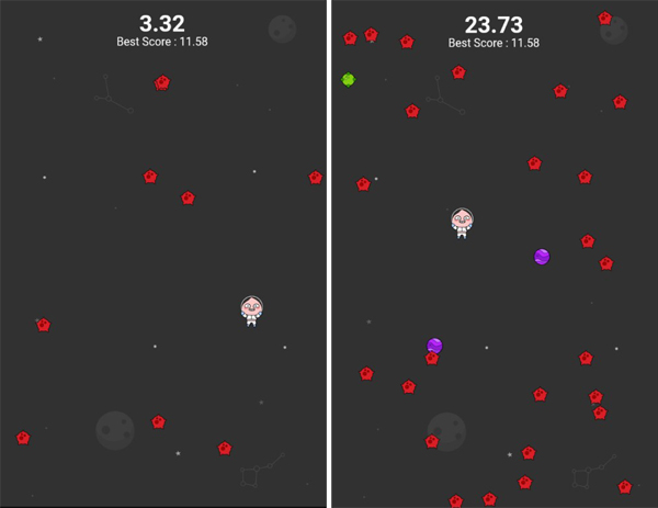 ‘어피치의 소행성’ 피하기는 점점 불어나는 소행성을 피하는 게임이다. 별도의 조작 버튼 없이 ‘어피치’ 캐릭터를 직접 터치해 움직일 수 있다. 생존 시간에 따라 점수가 매겨지는데 소행성은 점차 다른 종류로, 기하급수적으로 증가한다. 새로운 소행성은 벽면에 튕겨 되돌아오는 등 특수 효과가 있다.