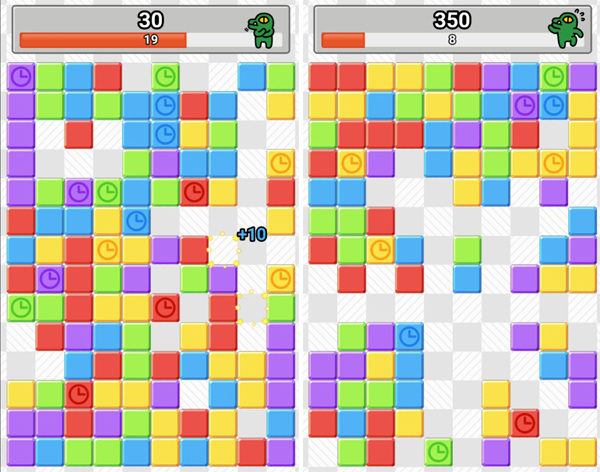 먼저 ‘콘의 네모네모팡’은 빈 공간 중 회색으로 칠해진 곳을 누르면 십자 방향에서 같은 색 블록이 제거되는 방식의 게임이다. 앞에 다른 블록이 막혀 있으면 제거할 수 없다. 30초 제한시간동안 높은 점수를 얻기 위해선 동시에 많은 블록을 제거해야 하며 시계가 그려진 블록을 제거하면 추가 시간을 얻을 수 있다. 만약 잘못 클릭할 경우에는 시간이 차감돼 신중한 선택이 필요하다.