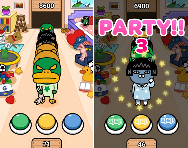 ‘네오의 파자마 파티’는 세 가지 캐릭터가 일렬로 나오며 색깔에 맞는 버튼을 누르면 된다. 버튼을 잘못 누르더라도 시간이 차감되지는 않지만 콤보가 초기화된다. 콤보를 모으면 일종의 피버 타임인 파티모드가 시작되는데, 세 버튼 중 아무 버튼이나 눌러도 점수를 받을 수 있다.