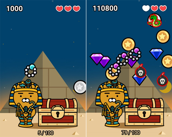 ‘라이언의 보물상자’는 상자에서 나오는 여러가지 물건 중 보물을 골라 터치하면 되는 게임이다. 폭탄이나 뱀 등을 선택하면 목숨이 깎인다. 목숨은 총 세 개 있으며, 보석을 놓치지 않고 먹으면 콤보가 쌓여 피버 타임에 돌입할 수 있다. 피버 타임에는 짧은 시간 동안 폭탄을 제외한 보석만 나온다. 보석 점수는 각기 다르므로 정신없이 튀어나오는 후반부에는 높은 점수의 보라색 보석을 골라 터치하는 게 중요하다.