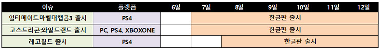 먼저 '얼티메이트마벨대캡콤3'가 7일 출시돼 국내 게이머들을 사로잡을 예정이다. 또 신작 FPS '고스트리콘:와일드랜드'가 7일 발매된다. PS4로 출시되는 '레고월드'와 '카오스차일드'도 한글판의 정식 발매를 눈앞에 두고 있다.