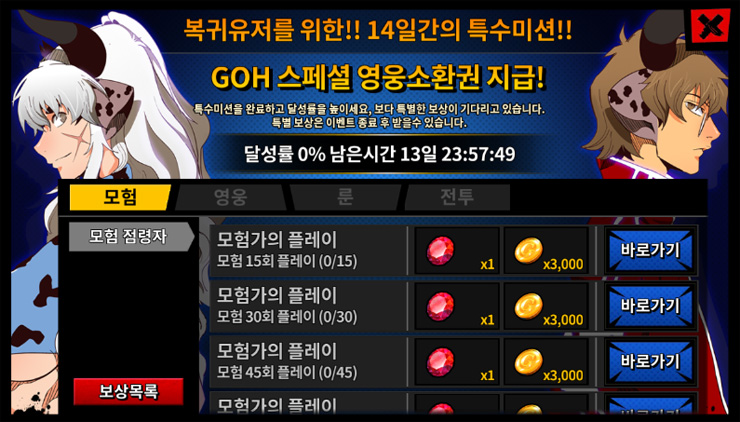 복귀 유저 특수 미션은 앞서 설명한 미접속 15일차 이상에 해당하는 이용자가 수행할 수 있는 이벤트다.