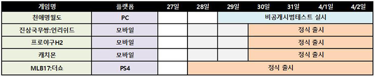모바일게임 중에는 액션 RPG '진삼국무쌍:언리쉬드'와 야구매니지먼트게임 '프로야구H2', AR게임 '캐치몬'등 총 3종이 정식 출격을 앞두고 있다. 이번 주 출시되는 콘솔게임은 야구게임의 전통강자 'MLB17:더쇼' 1종이다.