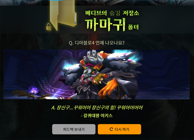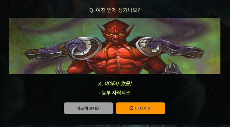 만우절 페이지답게 어떤 질문을 올리더라도 와우에서 유명한 대사들이 무작위로 나온다.