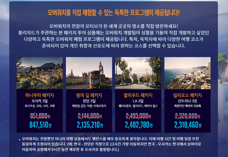 오버워치에는 개발자들이 개발하고 싶었던 목적지를 체험하는 패키지 프로그램이 소개됐다. 프로그램 참가자에게는 4시 1분이 표기된 오버워치 배찌를 지급한다.