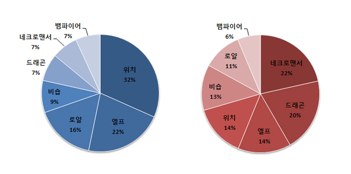 네크로맨서와 드래곤은 공동 최하위에서 10%이상 사용률이 증가해 1, 2위를 다퉜으며 반대로 ‘위치’는 1위에서 크게 사용률이 감소해 4위로 내려갔다.