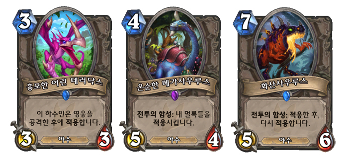 ‘화산사우르스’처럼 여러번 ‘적응’하는 카드도 있다. 화산사우르스는 카드를 낸 후 두 번 ‘적응’ 효과를 발휘한다. 또 뒤에 소개할 신규 요소인 ‘퀘스트’를 통해 얻는 ‘보상카드’ 중에는 자기 자신에게 5번 ‘적응’ 능력을 부여하는 하수인도 있다.