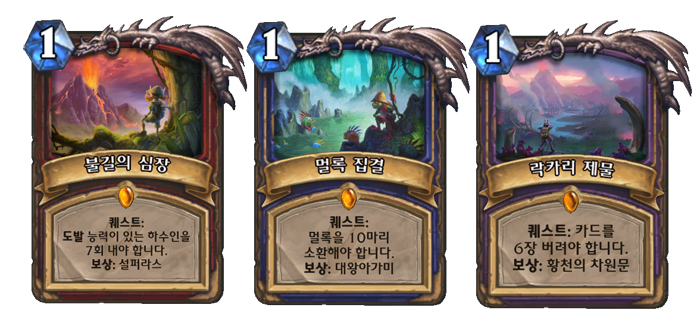 새로운 요소인 ‘퀘스트’는 일종의 ‘비밀’처럼 작용한다. 전설등급 카드로만 존재하며 따라서 덱에 한 장만 넣을 수 있다. ‘퀘스트’ 카드는 항상 손에 들고 게임을 시작한다.