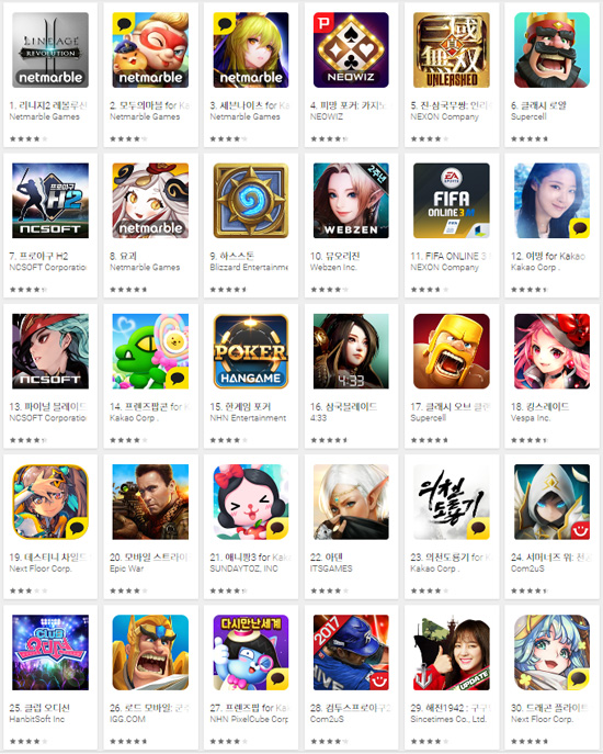 ▲ 2017년 4월 10일 오전 국내 구글플레이 게임부문 최고매출 순위 갈무리