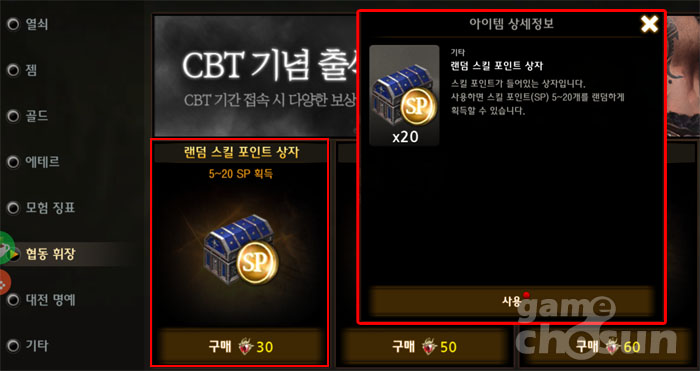 협동 모드는 CBT 현재 2인이 플레이 하는 파티 던전과, 4인이 플레이 하는 레이드 2종이 준비되어 있는데 이들 콘텐츠를 플레이하면 확정 보상으로 '협동 휘장'을 몇십 포인트 얻을 수 있고, 부가적으로 여러 장비를 노려볼 수도 있다. 스킬포인트 랜덤 상자가 1개 30포인트에 판매되고 있으니 상당량을 구매할 수 있단 얘기다.