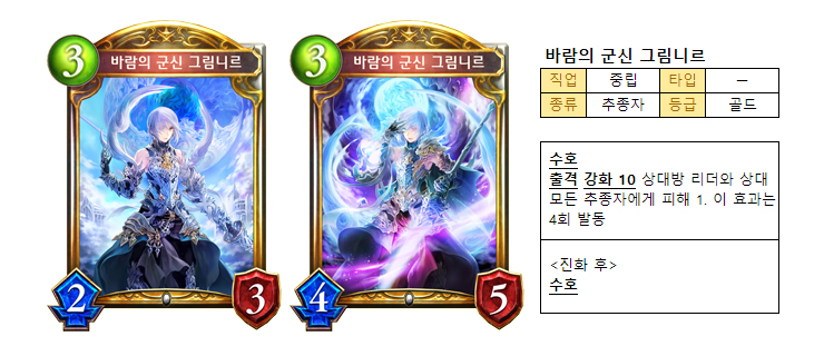비용3 추종자 ‘바람의 군신 그림니르’는 2/3에 수호 능력을 가졌다. 비용 10으로 강화됐을 경우에는 상대방 리더와 모든 추종자에게 피해 1을 입히는 효과를 4회 발동한다.