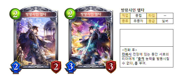 2/2 평범한 능력치의 추종자 ‘방랑시인 엘타’는 막강한 진화 시 효과를 가졌다. 진화한 엘타가 전장에 있으면 양 플레이어는 출격 능력을 발동할 수 없게 된다.