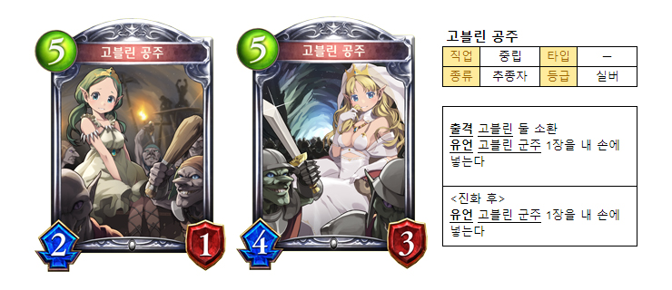 출격 시 전장에 소환되는 ‘고블린’은 1/2 추종자다. 여기에 유언으로 얻는 ‘고블린 군주’ 카드는 비용4에 5/5, 그리고 수호를 지닌 추종자다. 4치고 월등히 높은 능력치에 수호까지 갖추고 있어 저비용 카드가 많은 덱에 채용하면 강력한 전장 장악이 가능하다.