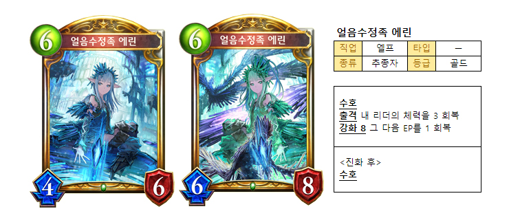 티아, 릴리에 이어 등장한 ‘얼음수정족 에린’은 4/6에 수호 능력이 있는 추종자다. 체력 뿐 아니라 EP(진화 포인트) 회복 효과를 지녔다.